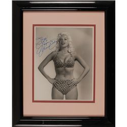 Stunning glossy 8 x 10 three-quarter length photo of the statuesque Mansfield in a leopard print bikini, signed in blue felt tip, “Love! Jayne Mansfie
