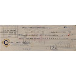 Marilyn Monroe Productions, Inc. business check, 8 x 2.75, filled out in type and signed by Monroe, payable to 20th Century Fox Corporation for $71.35
