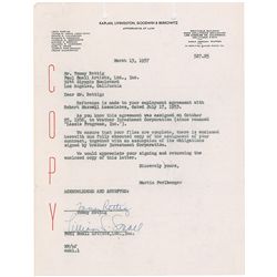 DS, one onionskin page, 8.5 x 11, March 13, 1957. Document from Rettig’s attorney regarding an agreement with “Wrather Investment Corporation (since r