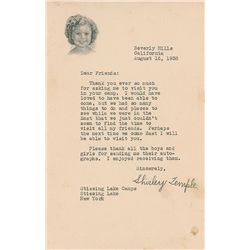 Early TLS, one page, 5.5 x 8.5, illustrated personal letterhead, Beverly Hills, August 16, 1938. Letter to Stissing Lake Camp in New York. In part: “T
