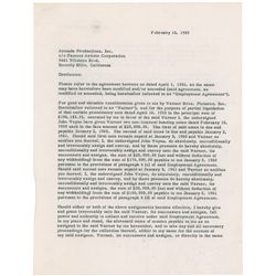 DS, two onionskin pages, 8.5 x 11, February 18, 1959. Agreement between Wayne and Warner Bros. for “the purpose of partial liquidation of that certain