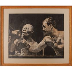 Enormous vintage 19.75 x 16 image of Marciano landing a thunderous punch to the face of Jersey Joe Walcott in their 1952 championship bout, signed and