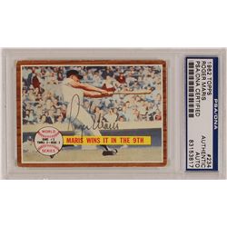 Scarce 1962 Topps baseball card depicting Maris’s game-winning home run in game three of the 1961 World Series, neatly signed in black felt tip. Encap