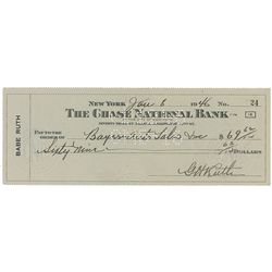 Personal check, 8.5 x 3, filled out and signed by Ruth, “G. H. Ruth,” payable to Bayers Auto Sales Inc. for $69.62, January 8, 1946. In fine condition