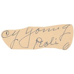 Vintage fountain pen signature, “Cy Young, Peoli, O,” on an off-white irregularly trimmed card. Signature is affixed to a 5.25 x 8 book page featuring