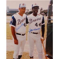 Color glossy 16 x 20 photo of Aaron and Mathews in their Braves uniforms, signed in blue felt tip by both. In fine condition, with a PSA/DNA label aff