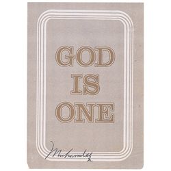 Religious pamphlet, entitled ‘God is One,’ 3.5 x 5, signed on the front in black ballpoint. Scattered creases, light overall rippling, and some dampst