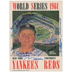 Original program for the 1961 World Series between the Yankees and Reds, 8.75 x 11.5, signed on the front cover and throughout in ink over 50 times. S