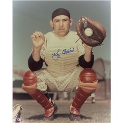Color glossy 8 x 10 photo of Berra in his catcher’s equipment, signed in blue felt tip. In fine condition, with a couple slight bends to lower right c
