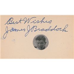 Vintage fountain pen signature, “Best wishes, James J. Braddock,” on an off-white 5 x 3 card bearing an affixed clipped magazine photo of the boxer. I