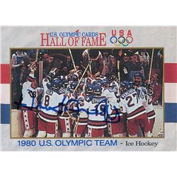 Color hockey card commemorating the 1980 US Olympic Team, 3.5 x 2.5, issued by Impel Marketing in 1991, signed in blue felt tip by Brooks. In fine con