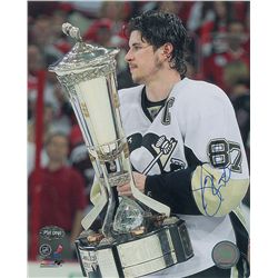Color glossy 8 x 10 photo of Crosby holding the Prince of Wales Trophy, signed in blue felt tip. In fine condition, with a PSA/DNA authentication labe