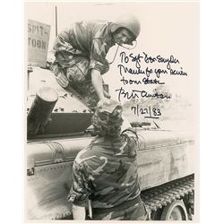 Unusual glossy 8 x 10 photo of Clinton in fatigues shaking hands with a National Guardsman on a tank, signed and inscribed in black felt tip “To Sgt.