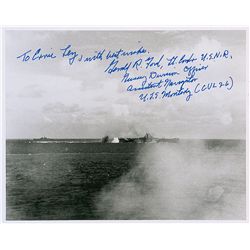 Glossy 10 x 8 photo of the Monterey under attack off Saipan in June of 1944, signed and inscribed in blue felt tip “To Ernie Ley, with best wishes, Ge