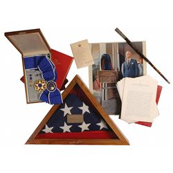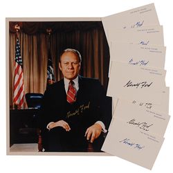 Nine items: one color glossy 8 x 10 photo of Ford as president, signed in gold ink; and eight mock White House cards, 4 x 2.5, each signed in blue or
