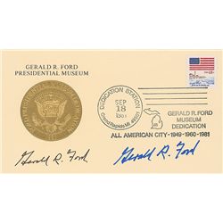 Color satin-finish 8 x 10 photo of the Fords posing outside, signed in blue ballpoint by Betty Ford and in black felt tip by Gerald Ford; and a commem