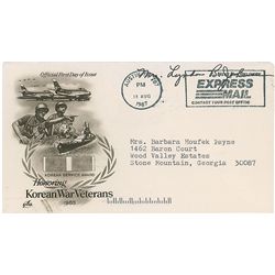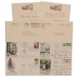 Five items: four FDCs with various cachets, three inscribed and all signed in ink or ballpoint by Johnson; and one 5.75 x 3.75 card bearing an image o