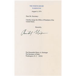 Typed souvenir presidential resignation, one page, 5 x 8, on mock White House letterhead, dated August 9, 1974 (but signed later). Nixon’s famous comm