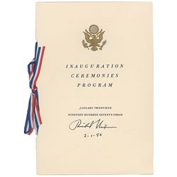 Program from Nixon’s 1973 inauguration, 6.25 x 9, bound with its red, white, and blue ribbon, signed on the front cover in black ink, “Richard Nixon 2