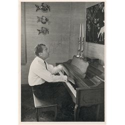 Lighthearted 4.25 x 6 postcard photo of Nixon playing the piano by Phillipe Halsman, signed in black felt tip. In fine condition, with irregular adhes