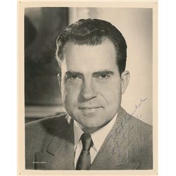 Vintage matte-finish 8 x 10 head-and-shoulders photo, signed and inscribed in blue ink “To Stephen Feyerabend, with best wishes from Richard Nixon.” I