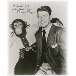 Glossy 8 x 10 photo of Reagan and Bonzo, signed and inscribed in black felt tip “To Irish Curtis, with best regards, Ronald Reagan.” In fine condition