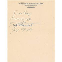Vintage ink signature, “Ronald Reagan,” on an off-white 8 x 10.25 sheet of Committee on Education and Labor stationery, also signed by three others (m