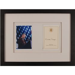 Embossed bookplate, 3.25 x 5, signed in black felt tip, “Ronald Reagan.” Double-matted and framed with a photo of Reagan giving a speech to an overall
