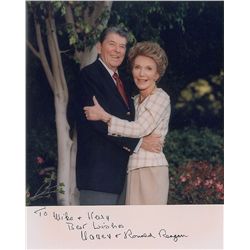 Color satin-finish 8 x 10 photo of the Reagans embracing each other, signed and inscribed in the lower border in black ink “To Mike & Kerry, Bes...