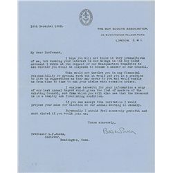British military officer and founder of the world scouting movement (1857–1941). TLS signed “Baden-Powell,” one page, 8 x 10, Boy Scouts Association l