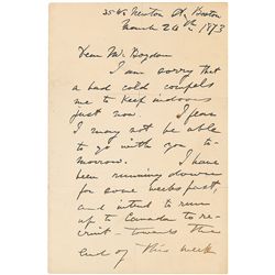 ALS signed “A. Graham Bell,” two pages, 4.5 x 7, March 24, 1873. Letter to Mr. Bogdon. In part: “I am sorry that a bad cold compels me to keep indoors
