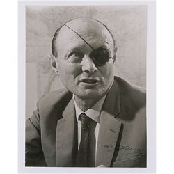 Glossy 8 x 10 photo of Dayan, signed in the lower right in fountain pen, “M. Dayan.” Light scattered bends, creases, and surface impressions, otherwis