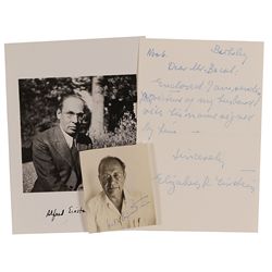 Three items: one glossy 5 x 7 photo of noted musicologist and Albert’s cousin, Alfred Einstein, signed in the lower border in fountain pen; one matte-