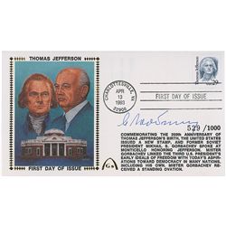 Limited edition FDC, numbered 529/1000, with a cachet honoring Thomas Jefferson, signed in blue ballpoint, “M. Gorbachev.” In fine condition. Accompan