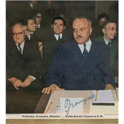 Soviet statesman and diplomat (1909–1989). Color 7 x 7.5 magazine photo, signed in fountain pen, “A. Gromyko.” In fine condition, with some slight sur