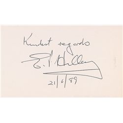 Felt tip signature, “Edward Teller,” on an off-white 3 x 1 label, affixed by Teller to a color glossy 5 x 7 photo. In fine condition, with some light