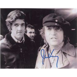 Satin-finish 10 x 8 photo of Kerry standing behind John Lennon at an anti-Vietnam rally in the early 1970s, signed in blue felt tip by Kerry. In fine