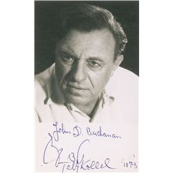 Matte-finish 2.25 x 3.75 photo of Kollek by Alfred Bernheim, signed and inscribed in blue ballpoint, “John D. Buchanan, Teddy Kollek, 1973,” and also