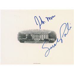 Engraved portrait of the White House, 8 x 6, by the Bureau of Engraving and Printing, signed in blue felt tip by John McCain and Sarah Palin. In fine