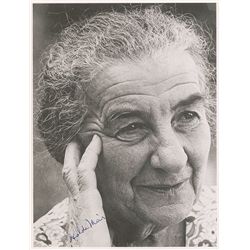Uncommon 5.5 x 7.25 cardstock photo of Meir touching her ear, signed in the lower left in blue ballpoint. In fine condition, with lightly trimmed edge
