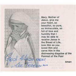 Printed prayer slip, 4.25 x 5.5, with an image of Mother Teresa with her hands clasped in prayer, signed at the bottom in blue felt tip, “God bless yo