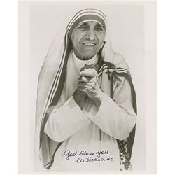 Glossy 8 x 10 photo of Mother Teresa with her hands clasped in prayer, signed in black felt tip, “God bless you, M. Teresa mc.” In fine condition, wit