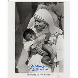 Glossy 8 x 10 photo of Mother Teresa cradling a child, signed in blue felt tip, “God bless you, M Teresa mc.” In fine condition, with a few scattered