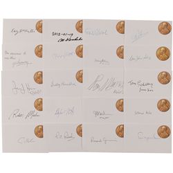 Twenty felt tip and ballpoint signatures on individual off-white 5 x 3 cards, each bearing an image of the Nobel Prize medal. Signers are: Mairead Cor