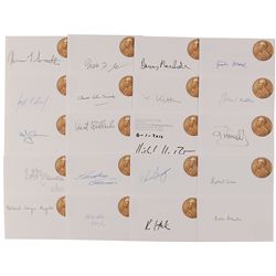 Twenty felt tip and ballpoint signatures on individual off-white 5 x 3 cards, each bearing an image of the Nobel Prize medal. Signers are: Toni Morris