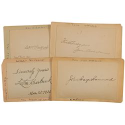 Fountain pen signatures of Luther Burbank, John Hays Raymond, Geo. W. Goethals, and Jane Addams on individual off-white cards, each affixed to slightl