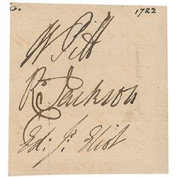 British politician (1759–1806) who served as Prime Minister from 1783 to 1801 and 1804 to 1806. Ink signature, “W. Pitt,” on an off-white 2 x 2.25 sli