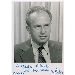 Vintage glossy 3.5 x 5 photo of Rabin in a suit and tie, signed and inscribed in fountain pen, “To Charles Alberts, with best wishes, Y. Rabin, 7-22-8