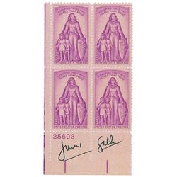 Block of four US postage stamps honoring those who helped fight polio, 2.25 x 4, signed in the lower border in black ink. In fine condition.
