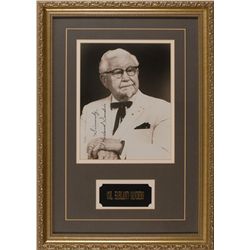 Ribbon-tie-and-white-suit-wearing fried chicken tycoon (1890–1980). Glossy 7 x 9 photo of Sanders in his trademark white suit, signed vertically in bl